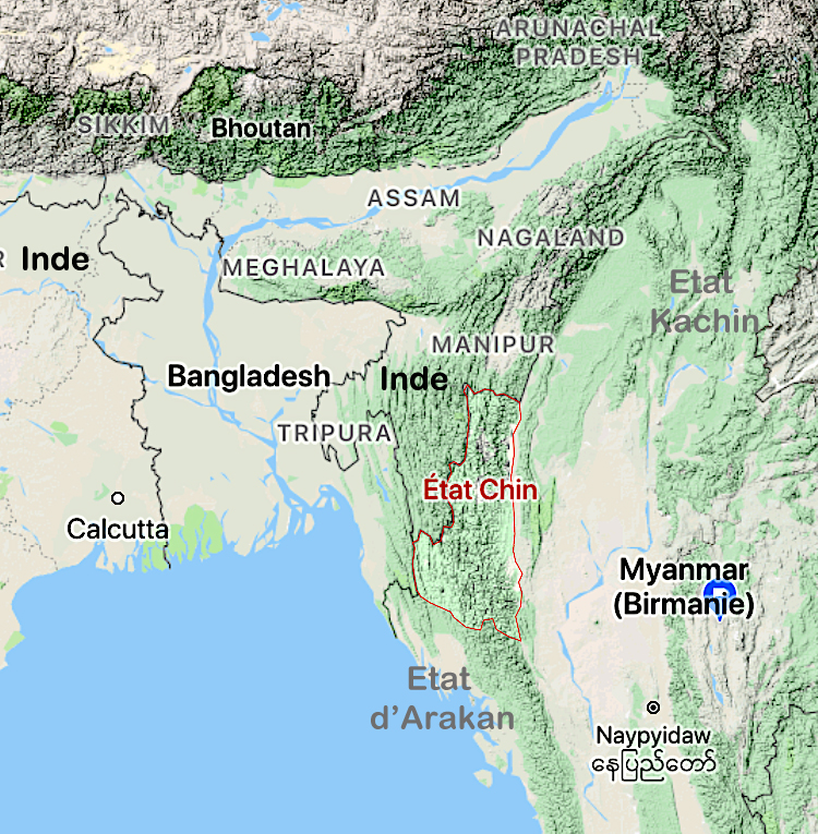 On les appelle « Les Collines Chin » mais leur sommet culmine à 3200 mètres d’altitude. Pendant longtemps cette région montagneuse, géographiquement très isolée, n’intéresse ni les Birmans à l’est, ni les Indien à l’Ouest, ni les Arakanais installés plus au sud au bord du Golf du Bengale.